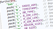 В качестве базы данных, Sypex Geo использует бинарный файл собственного формата. Этот формат является открытым и универсальным. При разработке формата, была проделана большая работа по оптимизации алгоритма. Благодаря чему, Sypex Geo работает значительно быстрее конкурентов, потребляет меньше памяти, а также производит меньше обращений к диску (из-за чего на загруженных серверах, разница еще больше в пользу Sypex Geo).